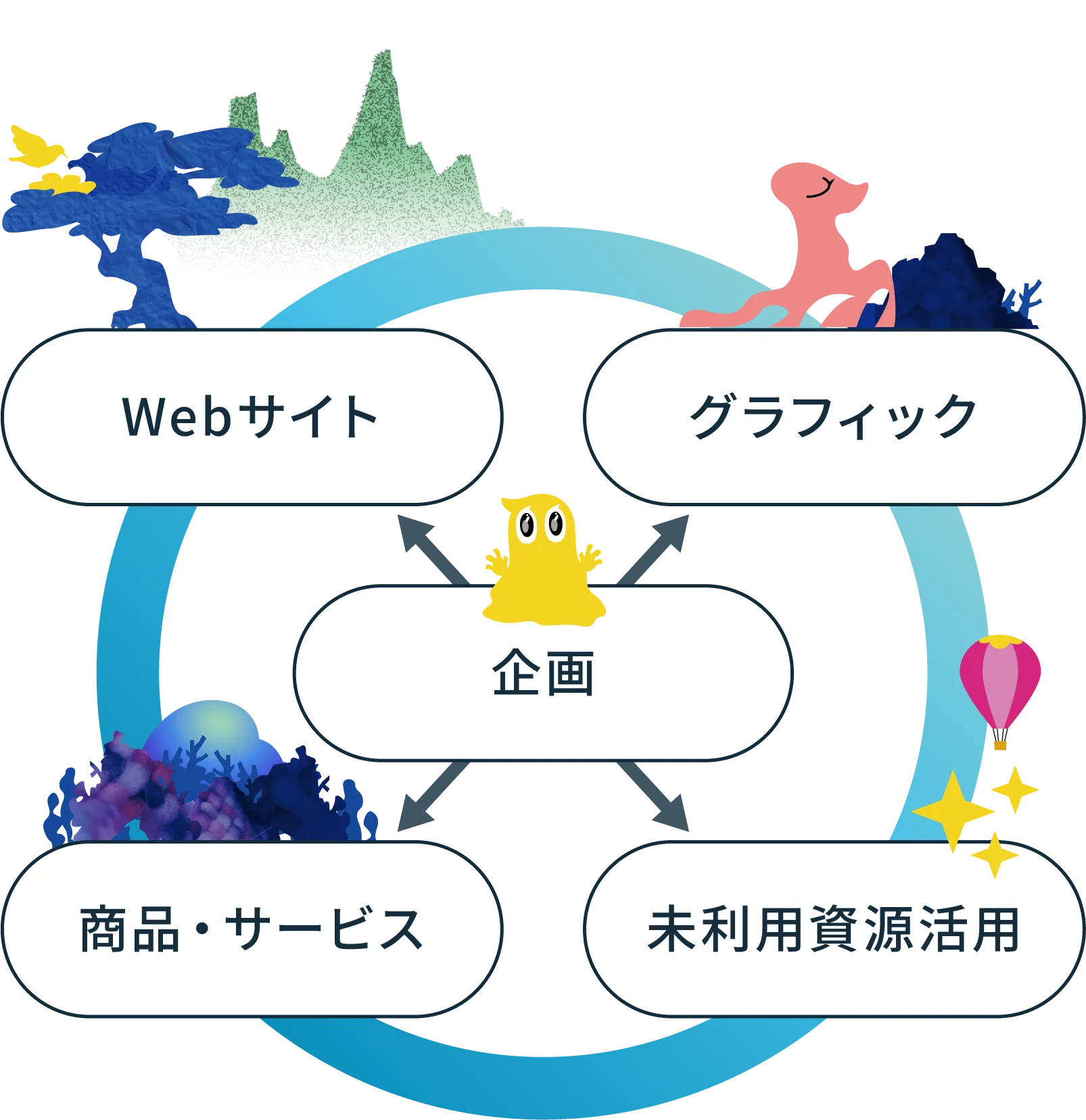 Webサイト制作、グラフィックデザイン、商品デザイン、未利用資源の活用を横断した幅広い領域でサービスを展開しています。