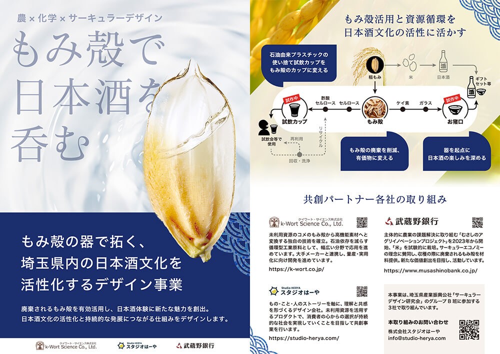 埼玉県産業振興公社の「サーキュラーデザイン研究会」で出会った3社で共創し、酒米のもみ殻を活用し日本酒文化を活性化するデザイン事業に取り組んでいます。